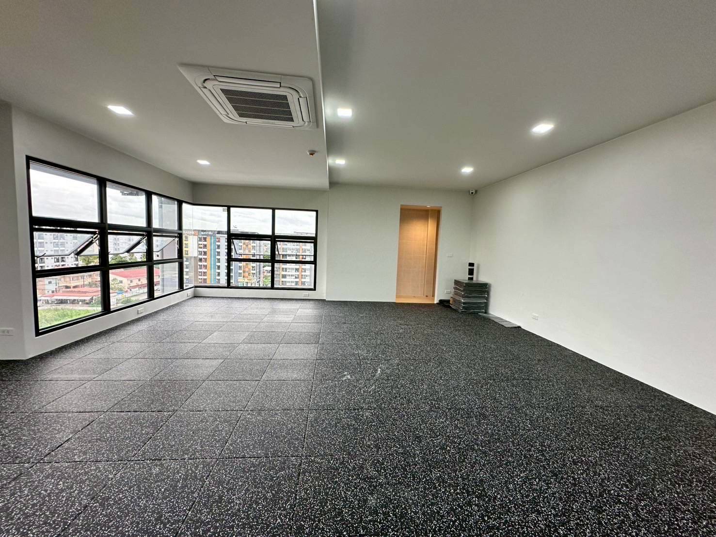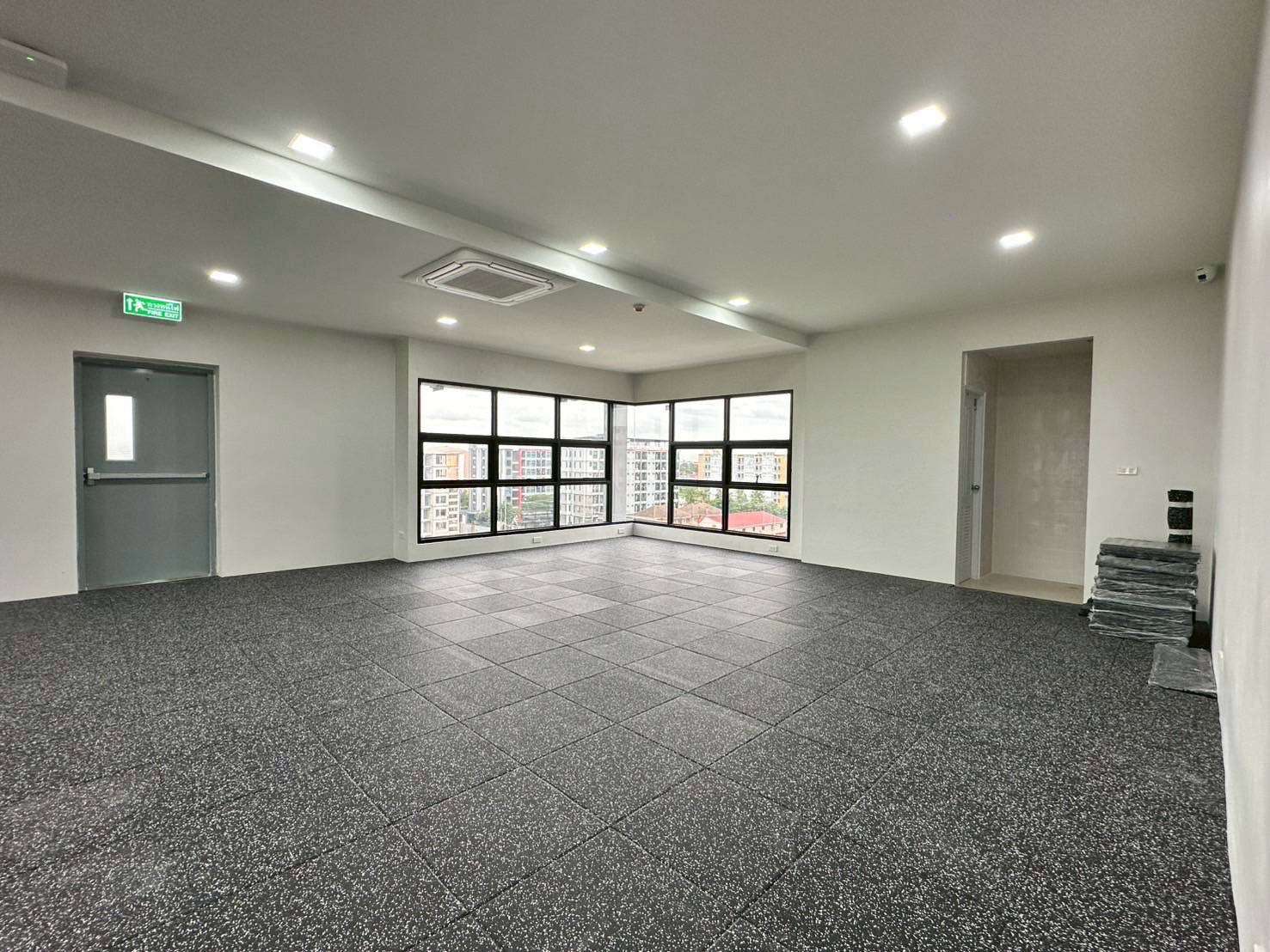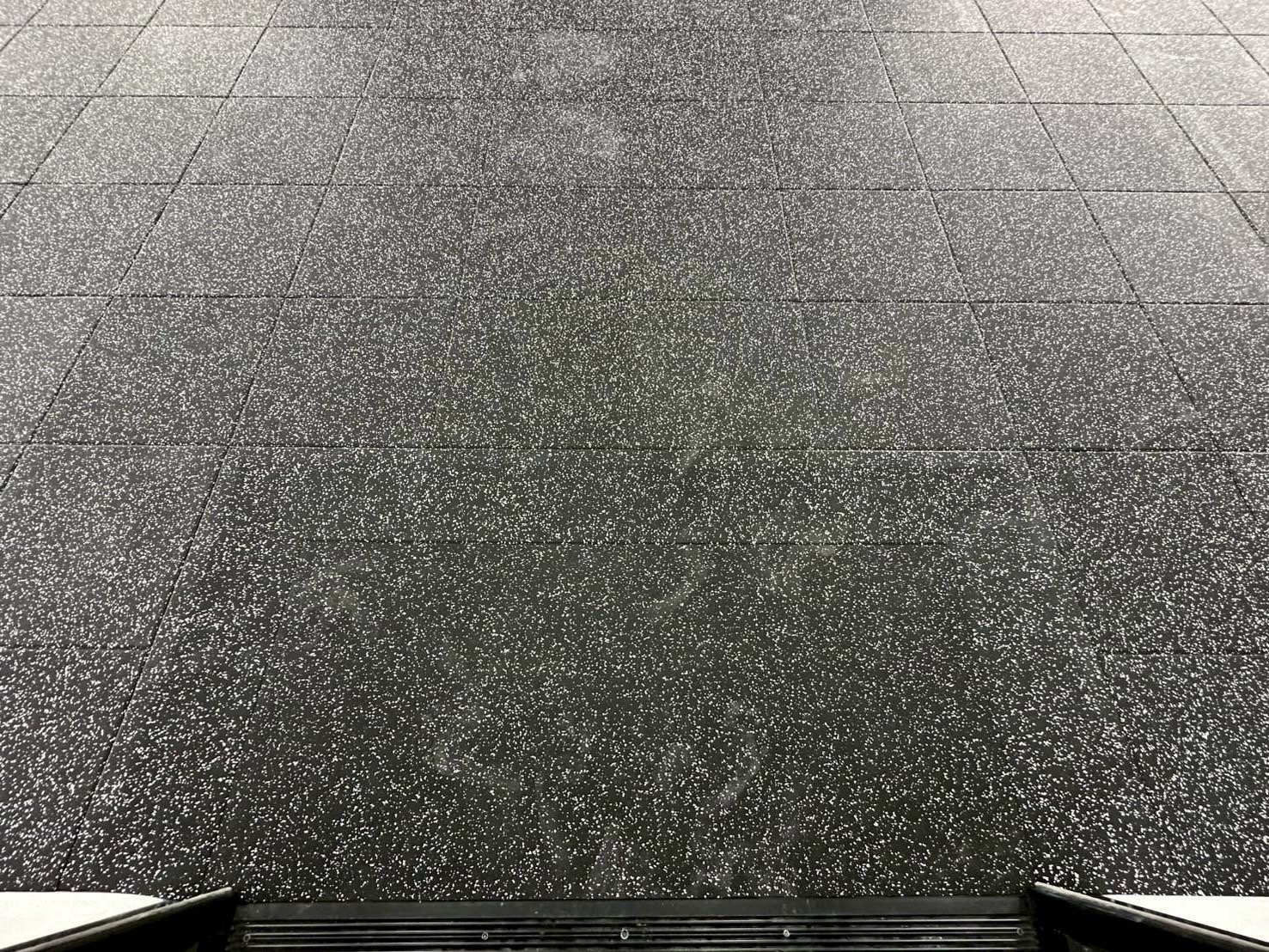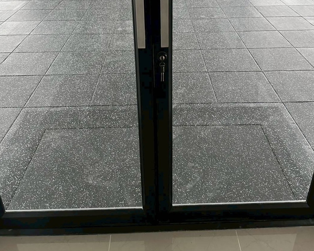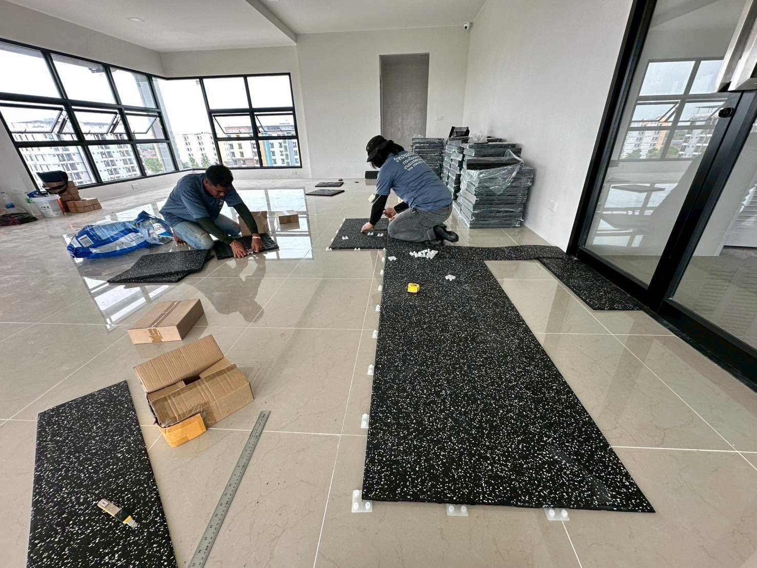 Star Rubber Crumb Tile – White Dots was installed in the fitness area without the need for adhesive, using plastic connectors. This is among our recommended materials, as the plastic locks pull the rubber tiles together, ensuring neat joints between them. For the entrance zone, the customer selected a thinner rolled rubber flooring than the primary material, making door operation effortless.